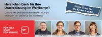 Wir danken allen Wählerinnen und Wählern für das ausgesprochene Vertrauen! An dieser Stelle möchten wir aber auch allen Helferinnen und Helfern danken, welche dieses Resultat erst möglich gemacht haben.